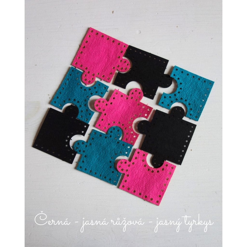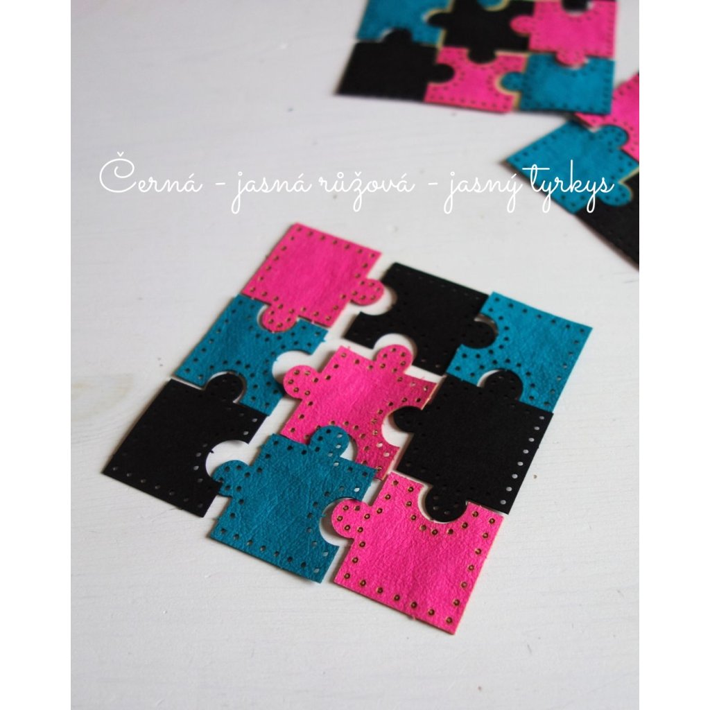 5. ČERNÁ - JASNÁ RŮŽOVÁ - JASNÝ TYRKYS - zářivá a přitom elegantní varianta puzzlíků. Černý papír je hladký, ostatní dvě barvy jsou mačkané.